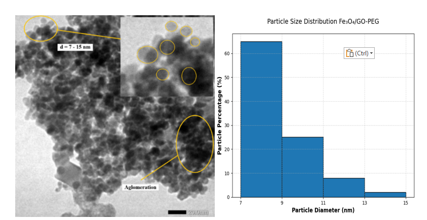 Transmission electron microscopy (TEM) provided direct morphological evidence of nanoparticle distribution and interfacial interactions among Fe₃O₄, GO and PEG components. As shown in Figure 2, spherical Fe₃O₄ nanoparticles with diameters ranging from 7 - 15 nm are uniformly anchored on GO sheets. This size range corresponds well with the crystallite size obtained from Scherrer and Williamson–Hall analyses (~7.6 nm), confirming that the nanoparticles are primarily monocrystalline [29]. Minor local clustering is observed, which can be attributed to weak magnetic dipole–dipole and van der Waals attractions rather than actual sintering, since the primary particle boundaries remain intact. Such limited aggregation is typical for magnetic nanomaterials and does not compromise nanoscale uniformity [30].