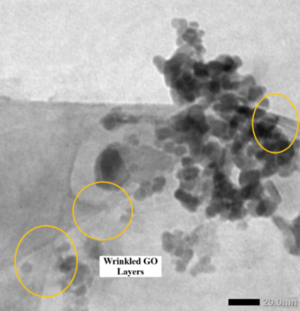 The morphology and microstructure of the nanocomposites were examined using a JEOL JEM-2100 transmission electron microscope operating at 200 kV. Samples were prepared by dispersing the powder in ethanol, ultrasonicated for 10 min and drop-cast onto carbon-coated copper grids. TEM images provided direct evidence of Fe₃O₄ nanoparticle dispersion on GO sheets, the presence of PEG coating layers and the average particle size distribution, which were correlated with XRD-derived crystallite sizes. High-resolution TEM (HRTEM) micrographs and selected-area electron diffraction (SAED) patterns were used to confirm the spinel structure and crystallographic orientation of Fe₃O₄ nanoparticles.