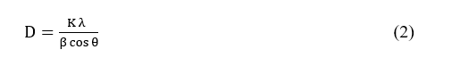 where D represents the mean crystallite size, K is the shape factor (0.9), λ is the X-ray wavelength, β is the line broadening at half the maximum intensity (FWHM) in radians and θ is the Bragg angle.
