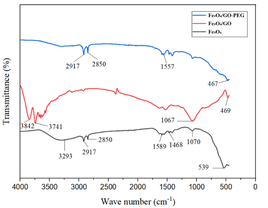 Fourier-transform infrared (FTIR) spectroscopy was employed to verify interfacial interactions among Fe₃O₄, graphene oxide (GO), and polyethylene glycol (PEG), and to confirm successful surface functionalization of the Fe₃O₄/GO–PEG nanocomposite [37,38]. The FTIR spectra of Fe₃O₄, Fe₃O₄/GO and Fe₃O₄/GO–PEG are presented in Figure 5, while the key vibrational assignments and spectral shifts are summarized in Tables 2 and 3.