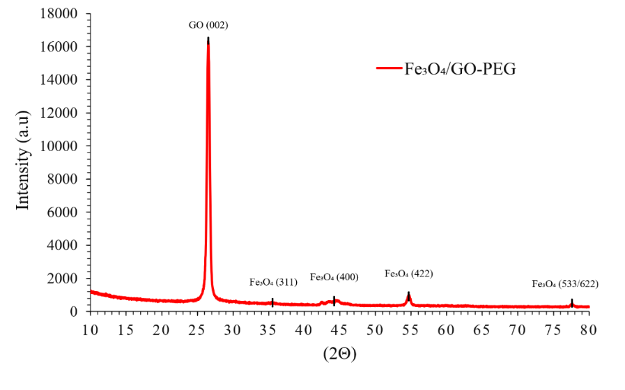 The crystalline structure of the synthesized Fe₃O₄/GO–PEG nanocomposite was examined by X-ray diffraction (XRD); the diffractogram is shown in Figure 1. Diffraction peaks at 2θ = 30.1°, 35.6°, 43.3°, 53.6°, 57.1° and 62.6° correspond to the (220), (311), (400), (422), (511) and (440) planes of magnetite (Fe₃O₄), consistent with the cubic inverse spinel (ICDD PDF No. 19-0629). A peak at 26.5° assigned to the (002) plane confirms the presence of graphene oxide (ICDD PDF No. 41-1487). No peaks attributable to maghemite (γ-Fe₂O₃) or hematite (α-Fe₂O₃) were observed, indicating high phase purity and the effectiveness of nitrogen protection during synthesis [22-24].