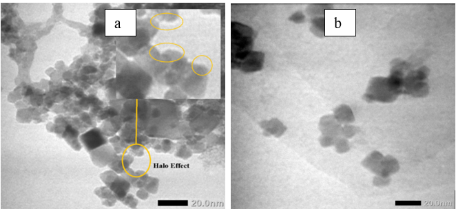 The effect of PEG modification is clearly observed when comparing Figures 4(a) - 4(b). In Figure 4(a), a faint amorphous halo (~3 - 5 nm thick) surrounding Fe₃O₄ nanoparticles indicates the presence of a PEG coating. This diffuse contrast, originating from the polymer’s low electron density, provides direct visual evidence of PEG encapsulation. The PEG shell forms a hydrated steric barrier that reduces magnetic dipole interactions and prevents nanoparticle agglomeration, thereby improving colloidal stability in aqueous media. Conversely, the unmodified Fe₃O₄/GO sample (Figure 4(b)) lacks this halo and exhibits denser nanoparticle clustering, confirming that PEG is essential for suppressing magnetic aggregation.