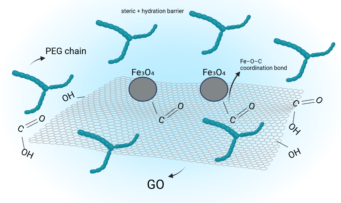 Fe₃O₄ nanoparticles (100 mg, corresponding to a 2:1 mass ratio to GO) were then added to the GO dispersion under continuous nitrogen flow. The mixture was mechanically stirred at 70 ± 2 °C for 2 h to promote electrostatic and coordinative interactions between Fe₃O₄ and the oxygen-containing functional groups of GO. During this process, Fe₃O₄ nanoparticles were anchored onto GO sheets through Fe–O–C coordination bonds, forming a homogeneous nanocomposite suspension. The resulting Fe₃O₄/GO nanocomposite was magnetically separated, rinsed three times with ethanol (30 mL each) to remove unbound particles and impurities, and subsequently dried at 60 °C under vacuum for 12 h to obtain a fine black powder ready for subsequent PEG functionalization.
