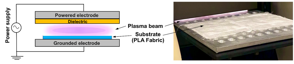 Figure 1 Schematic illustration and actual setup of the DBD plasma treatment applied to PLA fabric.