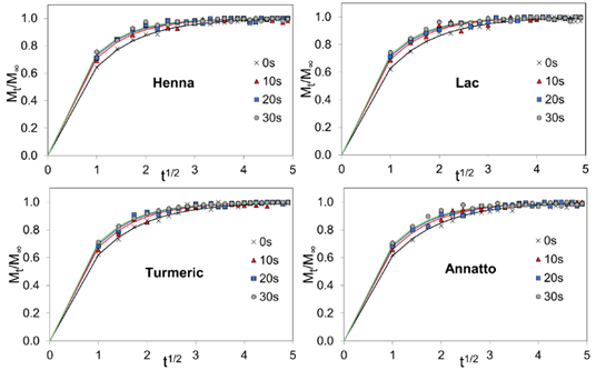 The effect of plasma treatment on dyeing was evaluated from dye uptake kinetics. A Fickian model with radial geometry under sink conditions was applied for yielding the diffusion coefficient that used as a quantitative descriptor of the dye-fiber interaction. First step, PLA fabric samples were immersed in dye solutions at 5% on weight of fiber (owf) with a liquor ratio of 1:30 of different natural dyes at 50 °C under gentle agitation. At each time point, the specimen was withdrawn and blotted with 2 layers of cellulose wipes under a 500 g load for 3 s, and weighed immediately in a draft-shield balance to obtain Wt. Immersion continued until the weight stabilized; the equilibrium mass (W∞) was then recorded. Dry mass (W0) was determined after vacuum drying at 50 °C. Dye uptake was calculated as: