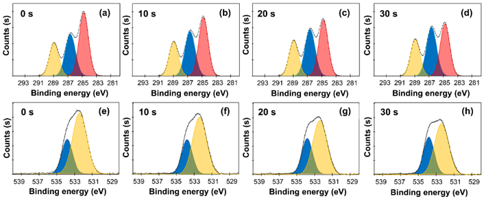 The effect of plasma exposure at defined exposure times on surface chemistry was analyzed by XPS, PHI VersaProbe 4, ULVAC-PHI (Japan). Measurements were conducted under high vacuum on multiple areas per specimen to check surface homogeneity. High-resolution scans of the C 1 s and O 1 s regions were acquired. The peak components in C 1s were deconvoluted into C–C/C–H, C–O, and O–C=O, and O 1s into C=O and O–C contributions. Relative atomic concentrations and O/C ratios were calculated from the quantified elements.