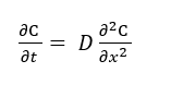 where C is concentration of the diffusing species (mol/m3), t is the elapsed time during the diffusion process (s), 𝑥 is the position or distance coordinate in the diffusion direction (m), 𝐷 is the diffusion coefficient.