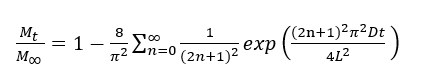 For a plane sheet of thickness 2L, assuming uniform initial concentration and constant surface concentration, the fractional uptake can be expressed as described by J. Crank [31]: