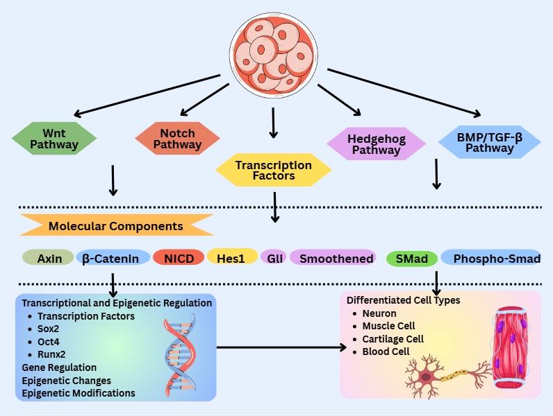The ability of stem cells to differentiate in a directed manner is a crucial foundation for cellular physiology and tissue regeneration [7]. This differentiation process is a complex mechanism regulated by molecular signaling pathways, transcription factors, microRNAs, and epigenetic mechanisms such as Deoxyribonucleic Acid (DNA) methylation and histone modifications [8]. Key pathways, including Wingless-related integration site (Wnt), Notch, Hedgehog, and Bone Morphogenetic Protein/Transforming Growth Factor-beta (BMP/TGF-β), influence cell fate determination, triggering the transition from self-renewal to specialization, and maintaining the balance between proliferation and apoptosis [9]. These mechanisms are not only crucial during embryonic development but also play a role in adult tissue regeneration and the maintenance of organ function [10]. Disruption of the regulation of stem cell differentiation can trigger various pathological conditions, including regeneration failure, organ degeneration, and tumorigenesis [11].