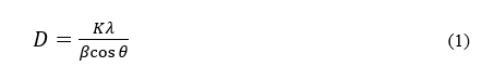 With K is k is a constant related to the crystalline shape, λ is wavelength, β is full width and half maximum (FWHM), and θ is reflection angle.