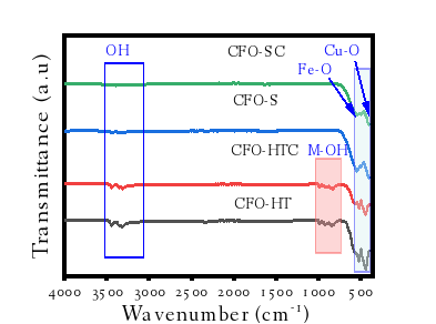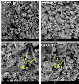 About 4 g of FeCl3.6H2O, 2.72 g of Cu(II) acetate, 2.05 g of sodium acetate and 0.007 g of sodium citrate were mixed with 200 mL of demineralized water. Into the solution, 50 mL of 0.2% of CTAB was added followed by seting up the solution to get pH 10 with the addition of NaOH solution. After furthermore followed by stirring for 1 h, the solution was transferred into a Teflon-lined autoclave, heated at 180 °C overnight. The obtained slurry from these steps was calcined at 500 °C for 2 h, and the sample was encoded as CFO-HTC.