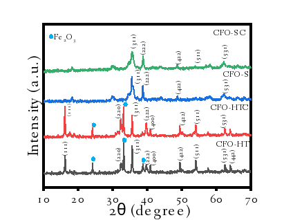 The XRD diffraction patterns of the prepared sample is presented in Figure 2. From the figure, it is seen that all sample show the characteristic peaks of CuFe2O4 at 2 of 16.2°, 33.2°, 35.6°, 38.7°, 49.5°, 54.1° and 62.5° that are in good agreement with the (111), (220, (311), (222), (400), (422), (511) and (440) planes, respectively referred to the Joint Committee on Powder Diffraction (JCPDS) No. 35-0425. In addition, the HT-prepared samples; CFO-HT and CFO-HTC express additional peak at 2 = 24.22° which potentially demonstrated the presence of Fe2O3. The formation of Fe2O3occurred due to the excess Fe ions in the precursor which accelerate to be hydrated under HT pressure and temperature. Similar phenomenon was obtained in the synthesis of CuFe2O4 reported in previous works [15].