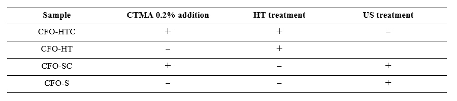 Similar procedure was performed without the addition of CTAB but in HT treatment, and the sample was encoded as CFO-HT. From US treatment, the HT traetment after coprecipitation was replaced by US irradiation to the precipitate for 1 h using commercial ultrasound chamber, and other steps are in same condition. The samples obtained from the synthesis by using CTAB and without CTAB were designated as CFO-S and CFO-SC. Figure 1 depicts the scheme of synthesis, and the summary of synthesis conditions is provided in Table 1.
