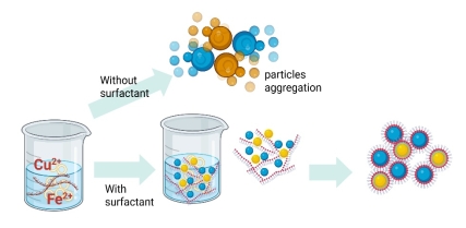 Several methods are used for the synthesis of copper ferrite, and these play an important factor to create physicochemical characters for furthermore determine the chemical activity of the material. The methods consist of the sol-gel, mechanochemical method, coprecipitation, microemulsion, hydrothermal method (HT), ultrasound-irradiation (US) and mechanochemical methods. The coprecipitation method is one of the most used methods for synthesis due to its simple and easiness. Additionally, the combination with HT, US or microwave irradiation were applied to intensity the crystallization and particles growth [5]. Similar to some other nanoparticles synthesis, synthesis routes control the physicochemical features of material, including optical properties [6]. In addition, surfactants influence the growth of nanoparticles.