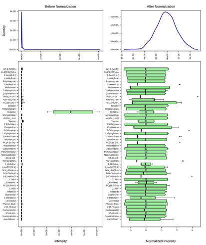 Figure 1 Density distributions and boxplots of metabolite intensities before and after normalization.
