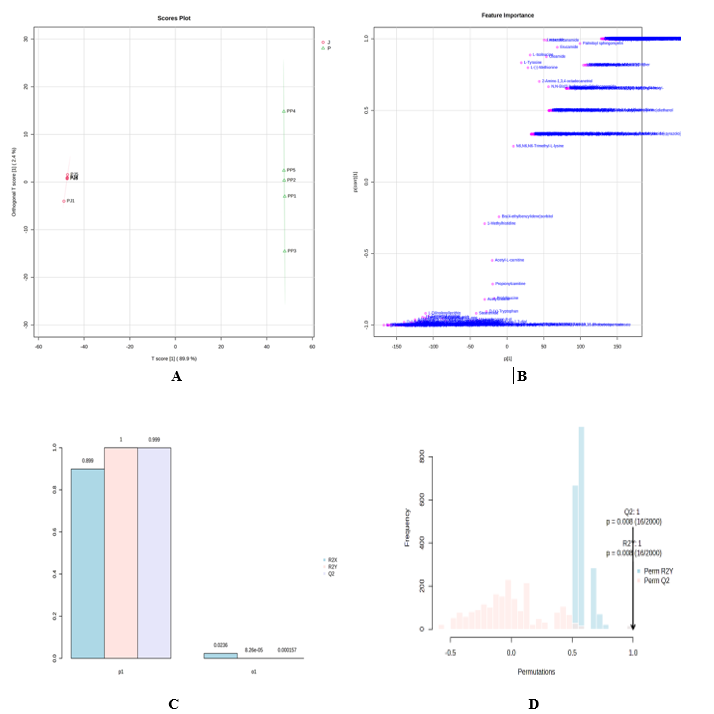 Figure 4 OPLS‑DA results. (A) OPLS‑DA score plot showing distinct clustering of J and P. (B) S‑plot indicating discriminatory metabolites. (C) Model performance statistics (R²X, R²Y, Q²). (D) Permutation test validating model robustness.