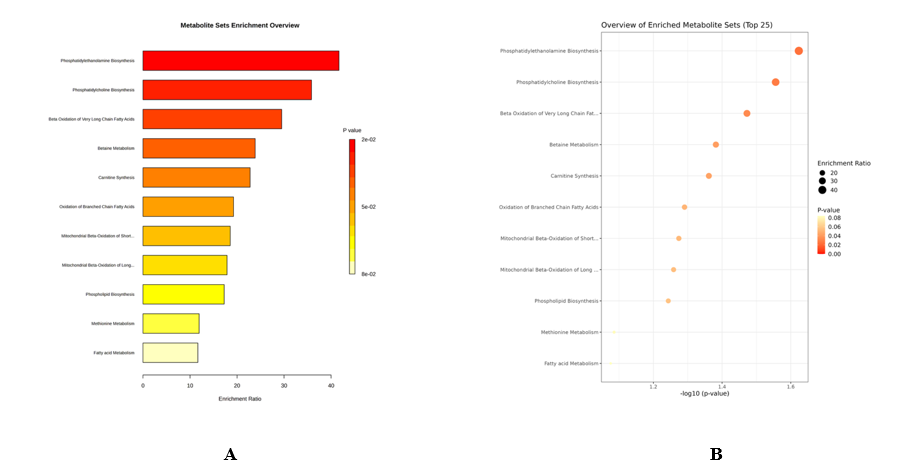 Processed data were exported into MetaboAnalyst 6.0 for chemometric and statistical interrogation. The dataset was structured into a two-dimensional matrix with samples as rows and metabolite features as columns. Prior to multivariate modeling, normalization by sum, log2 transformation, and Pareto scaling were applied to stabilize variance, correct skewness, and reduce the disproportionate influence of high-abundance metabolites.