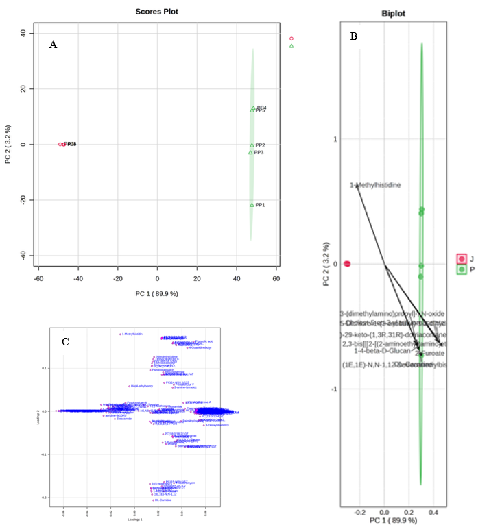 Figure 3 PCA analysis of pempek metabolomes. (A) PCA score plot showing separation of Jambi (J) and South Sumatra (P) samples. (B) PCA biplot identifying major discriminatory metabolites. (C) Loading plot highlighting the distribution of metabolites across PC1 and PC2.
