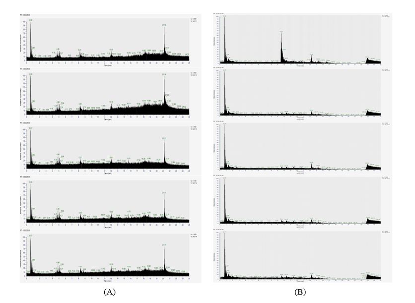 Figure 2 (A) Total-ion chromatograms (0 - 25 min) of Palembang pempek extracts for replicates P1 - P5; (B) Total-ion chromatograms (0 - 25 min) of Jambi pempek extracts for replicates J1 - J5.