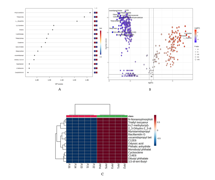 Figure 5 Biomarker identification. (A) VIP plot of top discriminatory metabolites. (B) Volcano plot showing statistically significant features by fold‑change and p‑value. (C) Heatmap clustering of discriminatory metabolites across J and P.