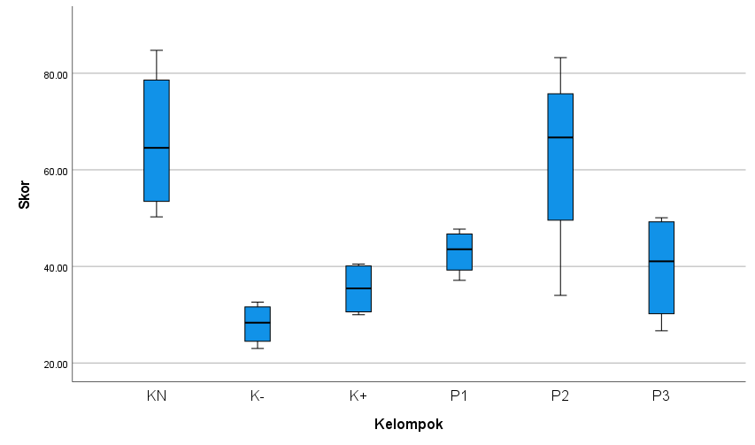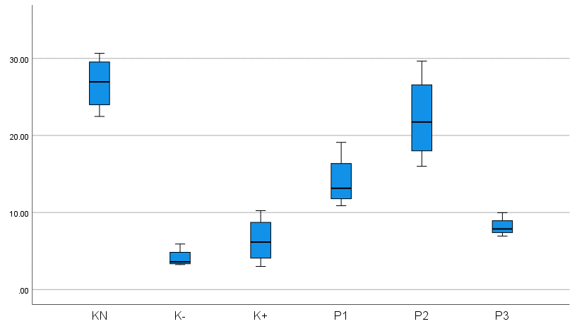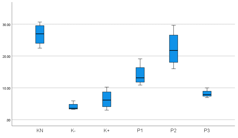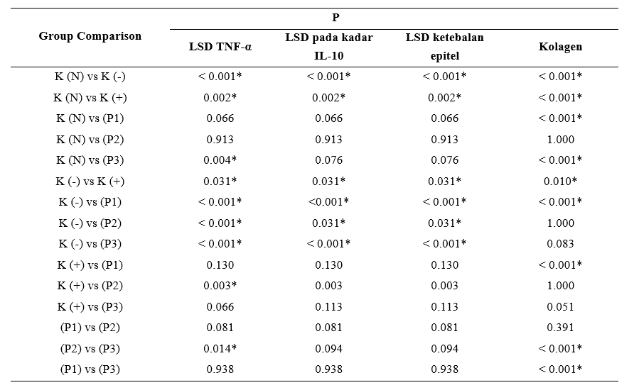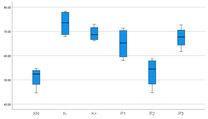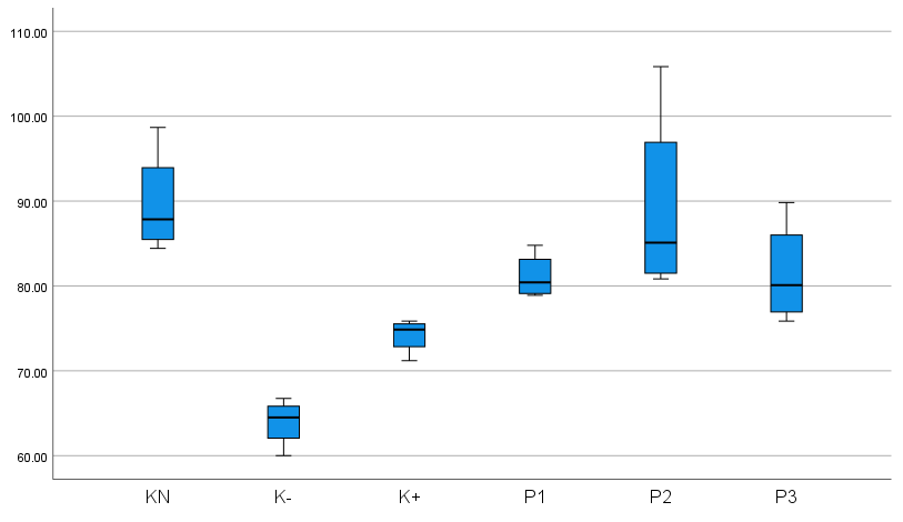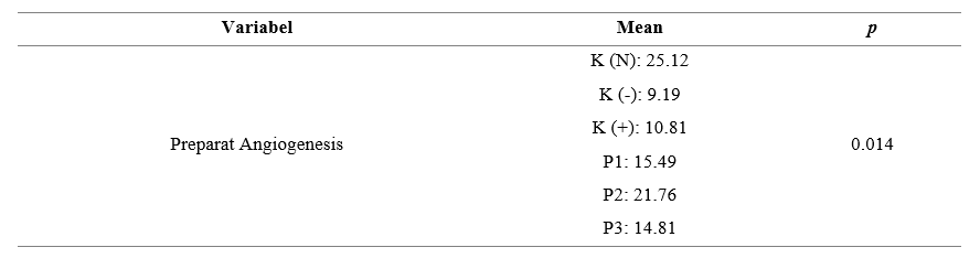 The results of Table 4 of the One Way Anova hypothesis test obtained a significant value of 0.014 (p < 0.05) so the hypothesis is accepted or can be interpreted that there is a substantial difference in the microscopic results of preparations on wound tissue that were tested for angiogenesis with CD31 in the K (N), K (-), K (+), P1, P2, P3 groups in Wistar rats with diabetic wounds. This is based on the results of statistical calculations of the preparations, indicating differences in the results among the 6 groups of staining of Wistar rat wound tissue preparations. This shows that the comparison of the average angiogenesis in P1 is not significant, that angiogenesis in K (-) is substantial to K (N), indicating that the rat model without type 2 DM, accompanied by wounds, has greater angiogenesis than K (-) because K (N) does not experience chronic inflammation, so it experiences a normal wound healing process. Angiogenesis in P1, P2, and P3 was significantly higher than in K (+) and K (-), indicating that bromelain enzyme administration and control with glibenclamide 0.09 mg/kgBW increased angiogenesis in type 2 diabetic rats with diabetic wounds at doses of 10%, 12.5%, and 15%.