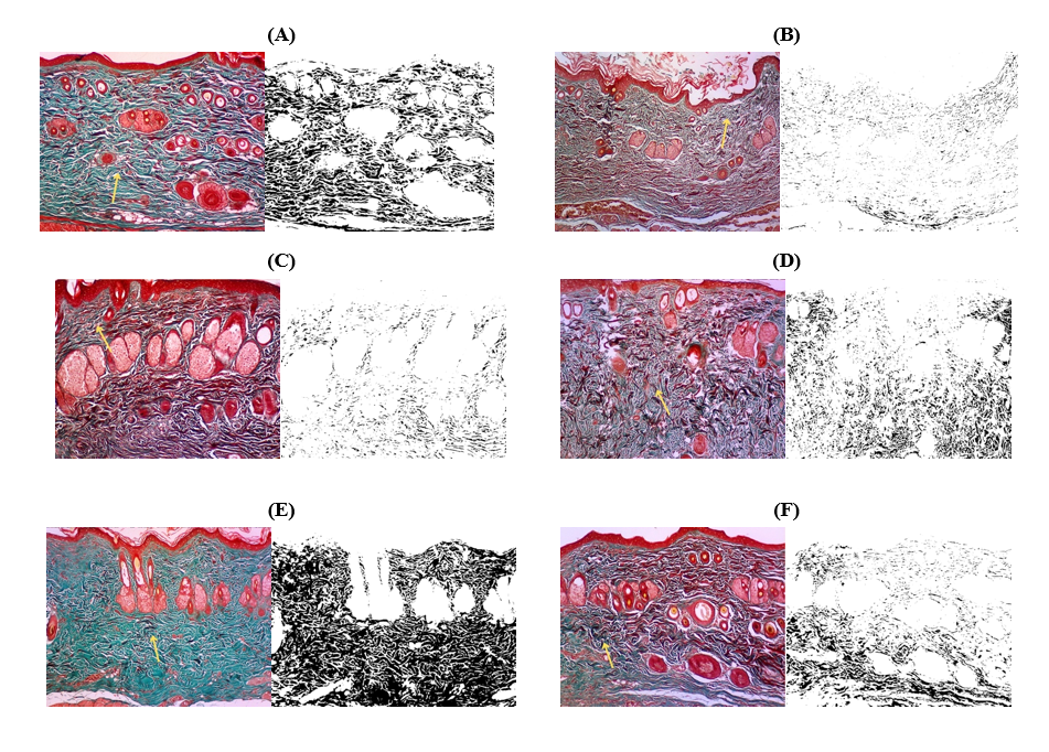 Histopathological evaluation of epithelial thickness and collagen density serves as a critical indicator of tissue regeneration and cutaneous remodeling processes. The final phase of wound healing involves extensive remodeling, characterized by the deposition and reorganization of collagen and elastin, alongside the differentiation of fibroblasts into myofibroblasts. Over time, myofibroblast activity and re-epithelialization determine the quality and elasticity of healed tissue, as well as the extent of scar formation, which is marked by irregular fibrous tissue proliferation and disorganized collagen fibers. The complex healing response aims to restore both dermal and epidermal structures, ultimately reestablishing skin barrier integrity, elasticity, and functionality. However, impaired healing may result in abnormal scarring, manifesting as hyperactive, erythematous, pruritic, or painful fibrotic tissue, clinically termed hypertrophic scars or keloids [52].
