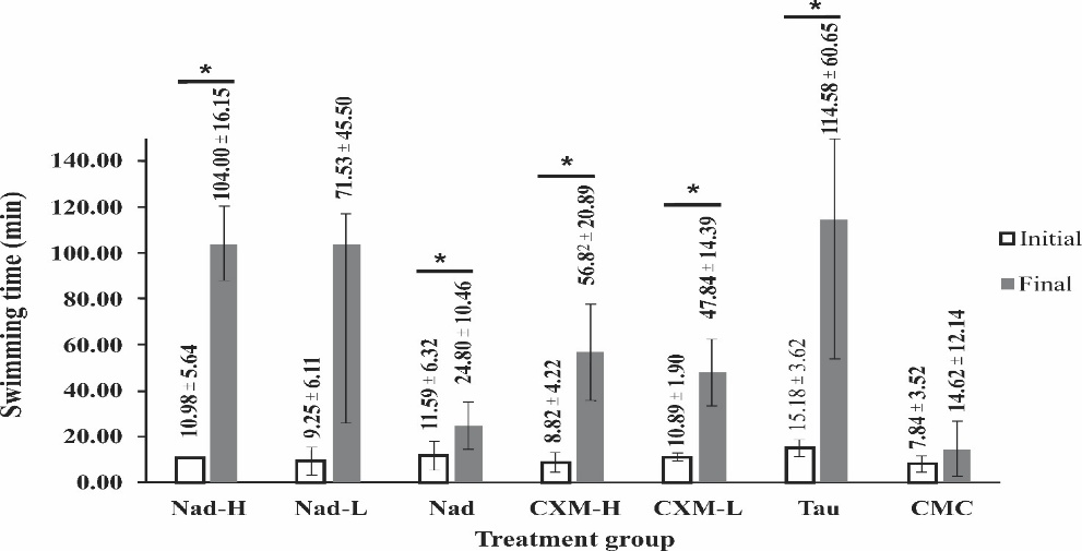 Figure 4 shows comparisons of the average initial and final swimming time for every group. For the average initial swimming time, the data fulfilled the assumptions of normal and homogenous data (p-value = 0.152 and p-value = 0.159, respectively). One-way ANOVA test obtained no significant differences between groups (p-value = 0.427), indicating that mice had similar swimming performance before treatment.