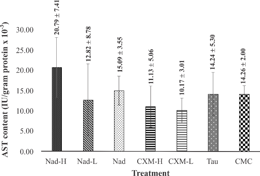 Figure 9 Effect of C. xanthorrhiza extracts on hepatic AST levels in mice after forced swimming test. Data are taken after 28 days of extracts treatment and presented as mean ± SD (n = 4). Nad: NADES extract of C.xanthorrhiza, CXM: C.xanthorrhiza maceration extracts, TAU: Taurine, CMC: Na- carboxymethyl cellulose (no significant differences among groups, p-value = 0.20, ANOVA).
