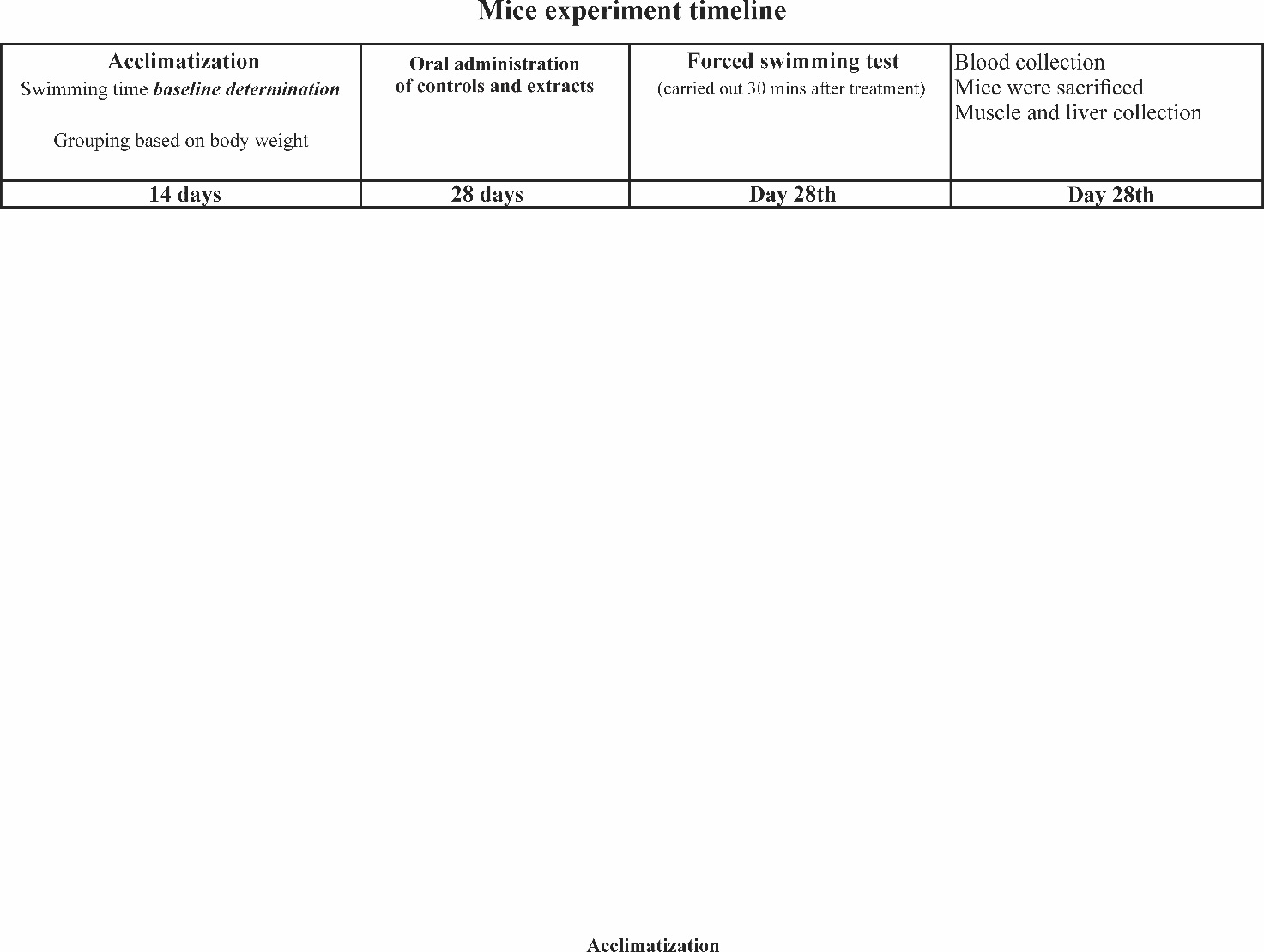 As mentioned above, mice performed a forced swimming test initially before treatment, and finally after treatment. A forced swimming test was conducted based on previous methods [22]. The initial swimming test was performed at the end of the acclimatization period. The final swimming exercise was conducted 30 min after the last administration on day 28. Mice were placed individually in an acrylic swimming pool (20×20×40 cm3) filled with water at temperature of 30 - 35 °C at 30 cm depth. Time was recorded from the start of swimming to the immobility time for 7 s i.e. when mice lose coordinated movement, stop struggling, and only float motionless in the water, making only trivial movements necessary to keep their head above water for 7 s [10]. After swimming, the mice were dried and kept warm.