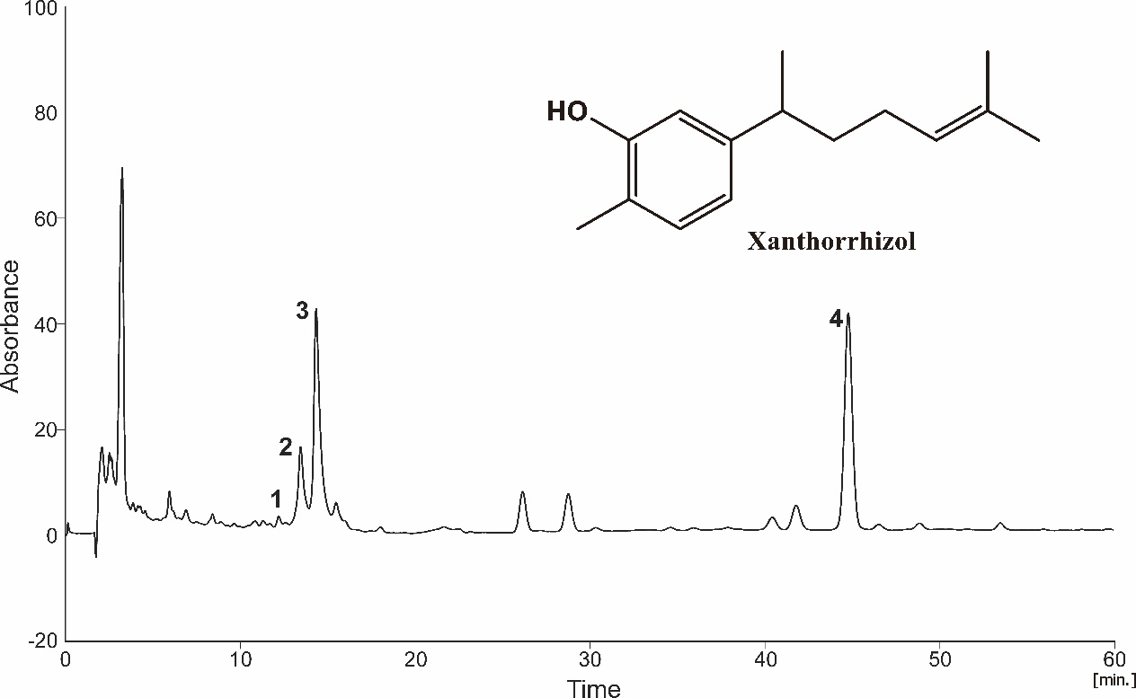HPLC analysis of XTZ in C. xanthorrhiza extracts was carried out by A Schambeck system with an S 9425 pump and an S 8515 vacuum degasser. The HPLC system was equipped with an S 4245 UV-Vis detector to analyze XTZ at 275 nm. Samples were run on a Zodiac C18 column (150×4.6 mm2, 5 μm) (Zodiac Life Sciences, Hyderabad, India). A gradient elution consisting of acetonitrile (eluent A) and formic acid 0.07% in water (eluent B) was used as a mobile phase at a flowrate of 0.6 mL/min at room temperature, with conditions as follows: 0 - 5 min, 45% - 50% A; 5 - 10 min, 50% - 55% A; 10 - 25 min, 55% - 60% A, 25 - 35 min, 60% - 65% A, 35 - 45 min, 65% - 70% A, 45 - 60 min, 70% - 100% A and 60 - 65 min 100% A.