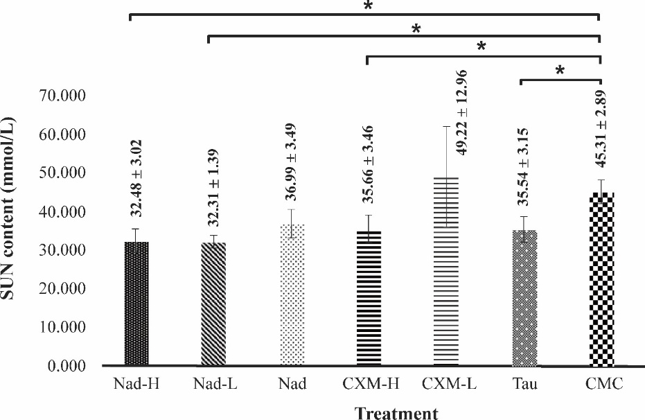 Figure 4 Pairwise comparison of before and after treatment for each group. Data mean ±SD (n = 4). Nad-H in mice treated with a high dose of NADES extract, Nad-L is a low dose of NADES extract, Nad is NADES only, CXM-H is a high dose of ethanol extract, CXM-L is a low dose of ethanol extract, TAU is taurine, and CMC is Na-CMC (1%). The sign * indicates a significant difference at p-value < 0.05 (paired t-test).