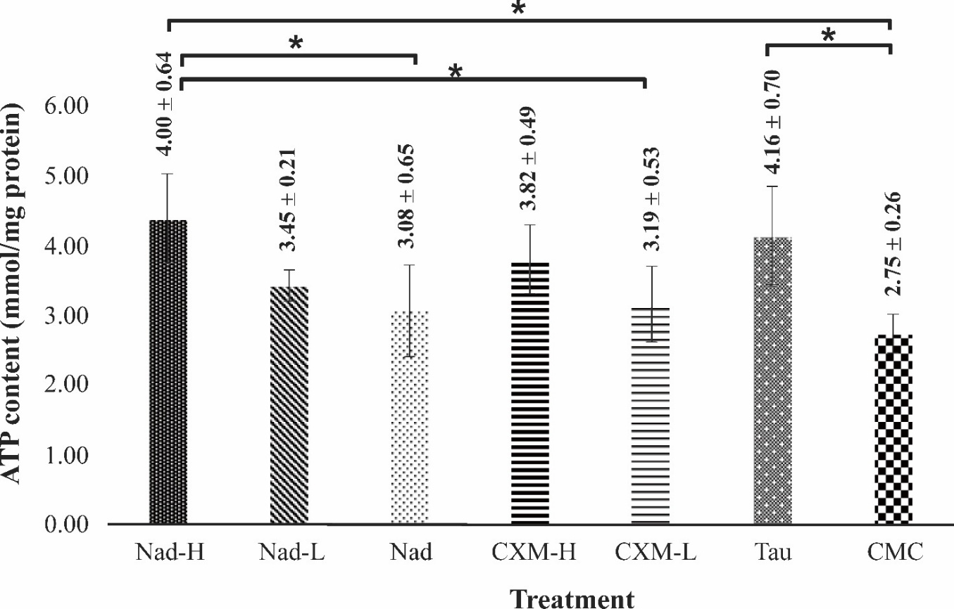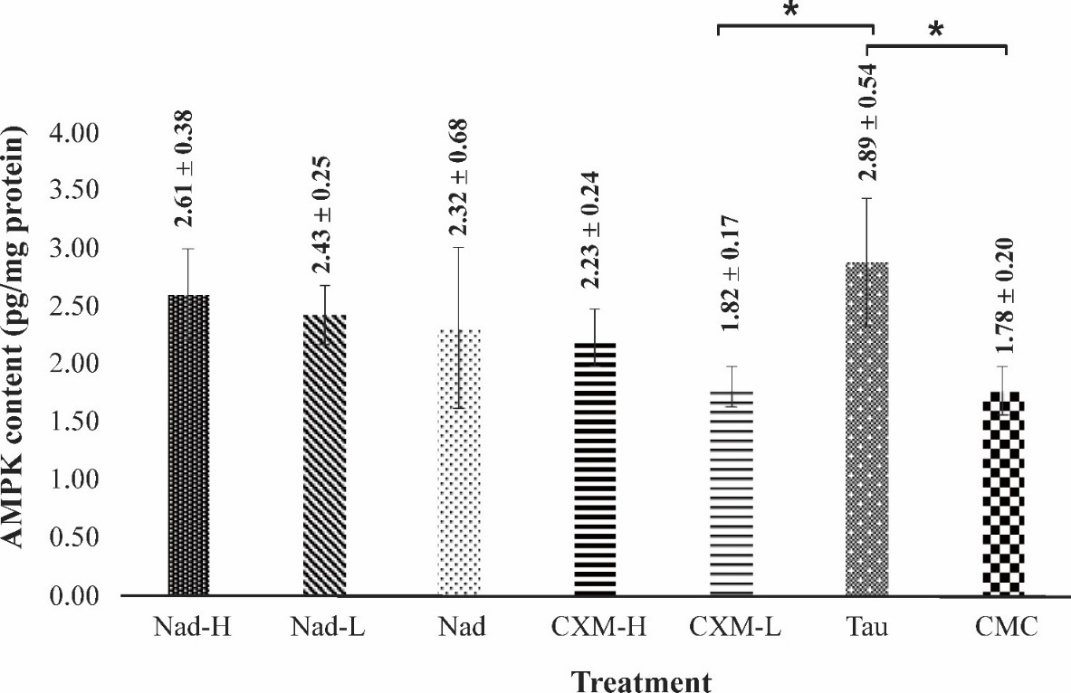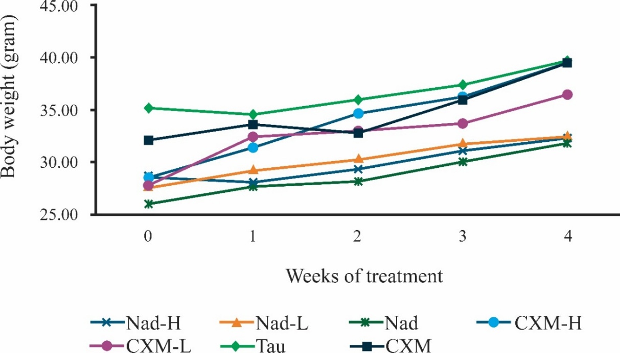 One-way ANOVA was conducted to evaluate the differences between groups and found that BW was significantly different between groups on all weeks (weeks 0, 1, 2, and 4, with p-values of 0.005, 0.029, 0.026, and 0.040, respectively), except for BW on week 3 (p-value = 0.125). It could be that mice were nearing growth plateau on week 3, thus their weight difference was less pronounced. Close observation of mice BW on week 0 showed that the average BW for mice of groups Nad-H, Nad-L, Nad, CXM-H, and CXM-L were 28.60 ± 2.35, 27.70 ± 0.77, 26.06 ± 1.42, 28.56 ± 4.10, and 27.75 ± 5.38 g, suggesting similar BW. Meanwhile, the BW of groups TAU and CMC were 35.18 ± 1.63 and 32.12 ± 2.29 g. Mice were allowed to access food and drink freely (ad libitum). This condition led to mice gaining weight significantly throughout the experiment period. However, close observation of mice BW on the last week of treatment (week 4) shows that mice in Nad-H, Nad-L, and Nad groups had similar BW i.e. 32.24 ± 3.62, 32.36 ± 2.81, and 31.71 ± 4.34 g, respectively. Meanwhile, similar BW were also observed for mice in CXM-H, TAU, and CMC groups, i.e. 39.52 ± 2.89, 39.70 ± 2.52, and 39.47 ± 8.91 g. Mice in CXM-L obtained 36.52 ± 3.02 g by week 4 of treatment.