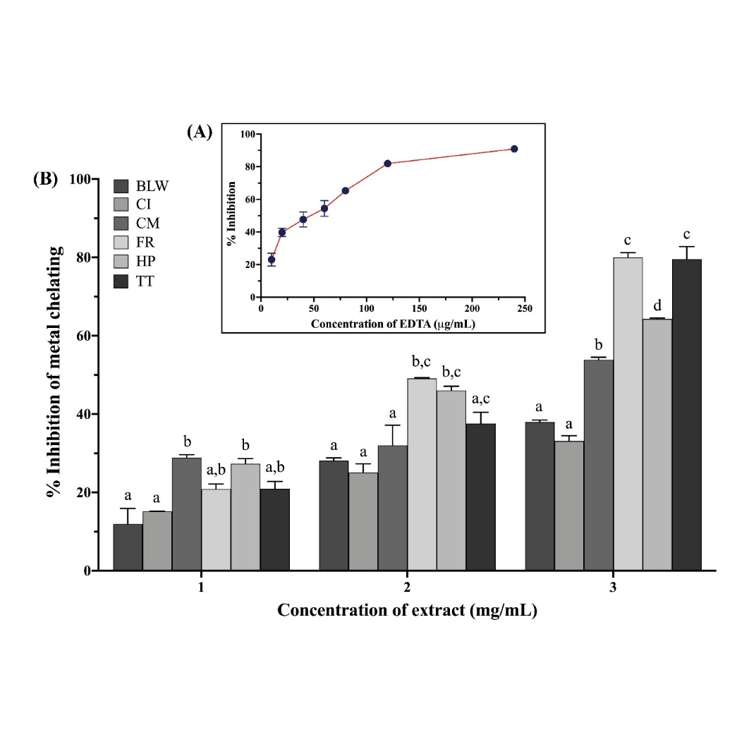 Figure 5 In vitro metal chelating activity of EDTA, BLW formulation, and its herbal components. (A) Metal chelation by EDTA, a standard chelating agent, is shown for comparison. (B) Percentage inhibition of metal chelation by the BLW formulation and its constituent herbal extracts at varying concentrations (1 - 3 mg/mL). Data are expressed as mean ± SEM (n = 3). Within each concentration, bars with different letters (a-d) indicate statistically significant differences (p < 0.05) as determined by 1-way ANOVA with Tukey’s post-hoc test. Abbreviations: EDTA, ethylenediaminetetraacetic acid; BLW, Benchalokawichian; CI, Clerodendrum indicum; CM, Capparis micracantha; FR, Ficus racemosa; HP, Harrisonia perforata; TT, Tiliacora triandra.