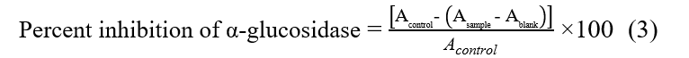 The inhibitory activity against α-glucosidase from Saccharomyces cerevisiae was evaluated with slight modifications to a previously published method [19]. In this assay, 50 μL of the sample or acarbose, the standard inhibitor, was combined with 100 μL of α-glucosidase enzyme solution at a concentration of 0.05 units/mL in phosphate buffer at pH 6.8. The mixture was incubated at 37 °C for 10 min. Thereafter, 50 μL of 0.1 M p-nitrophenyl-α-D-glucopyranoside (p-NPG) substrate was added, and the incubation was extended for another 20 min at 37 °C. The reaction was stopped by adding 50 μL of 0.1 M sodium bicarbonate solution. Absorbance was subsequently measured at 405 nm using a Varioskan LUX microplate reader (Thermo Scientific™, USA). The percentage inhibition of α-glucosidase activity was calculated using Eq. (3).