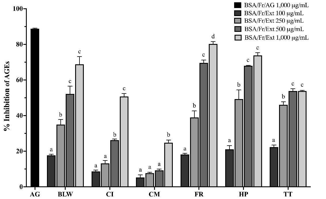 Data are presented as mean ± SEM (n = 3). Within each column, values with different superscript letters indicate significant differences (p < 0.05) by 1-way ANOVA with Tukey’s post hoc test. Different letters (a-f) denote statistically significant differences (p < 0.05). Abbreviations: BLW: Benchalokawichian; CI: Clerodendrum indicum; CM: Capparis micracantha; FR: Ficus racemosa; HP: Harrisonia perforata; TT: Tiliacora triandra; AG: aminoguanidine was used as a positive control.