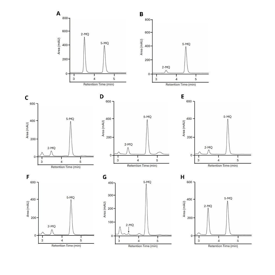 Figure 4 MGO trapping assay by HPLC: Impact of BLW extracts. The figure shows representative HPLC chromatograms from an MGO-trapping assay. (A) Control: 1 mM MGO plus phosphate buffer. (B-H) Treatments: 1 mM MGO solutions incubated with (B) aminoguanidine (AG), (C) Benchalokawichian (BLW), (D) Clerodendrum indicum (CI), (E) Capparis micracantha (CM), (F) Ficus racemosa (FR), (G) Harrisonia perforata (HP), and (H) Tiliacora triandra (TT). Peaks indicate the MGO derivative 2-methylquinoxaline (2-MQ) and the internal standard 5-methylquinoxaline (5-MQ).