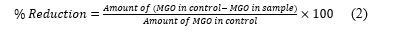 After incubation, 100 µL of OPDA and 20 µL of the internal standard 5-MQ were added to each sample, and the solutions were maintained at room temperature for 30 min to complete the derivatization reaction. The remaining MGO, which was converted to its 2-methylquinoxaline (2-MQ) derivative, was quantified using high-performance liquid chromatography with diode array detection (HPLC-DAD). The analyses were conducted on an Agilent 1260 Infinity II Prime system (Agilent Technologies, USA) using ChemStation software. Derivative separation was achieved with a Kromosil C18 column (5 µm, 100 Å, 250×4.6 mm2). The mobile phase comprised solvent A (water) and solvent B (methanol), with a flow rate of 1.2 mL/min. An aliquot of 20 µL from each sample was injected, with isocratic elution at 70% solvent B maintained for 10 min per run. Detection occurred at 315 nm, monitoring peaks of 2-MQ and 5-MQ. Quantitative analysis was conducted by comparing the ratio of peak areas of 2-MQ to 5-MQ. The percentage reduction of MGO was calculated using a specific Eq. (2).