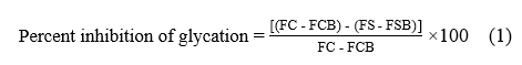 where FC represents the fluorescence measurement of the glycated control without any extract, and FCB refers to the fluorescence of the blank control, consisting of BSA without fructose. FS represents the fluorescence of the glycated sample, while FSB indicates the fluorescence of the blank sample, composed of BSA and the extract in the absence of fructose.
