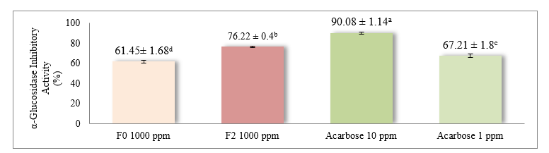 The results showed that F2 yogurt (10% red fruit oil) had significantly higher α-glucosidase inhibitory activity than F0 yogurt. The inhibitory effect of F2 was 78.08 ± 0.37%, whereas F0 was 64.46 ± 1.56%. The inhibition level of F0 at 1,000 ppm was slightly lower than that of acarbose at 1 ppm (67.21 ± 1.8%). Notably, F2 exceeded the inhibitory effect of acarbose at 1 ppm but was still lower than that of acarbose at 10 ppm (90.08 ± 1.14%).