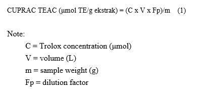 Antioxidant capacity was assessed using the Cupric Reducing Antioxidant Capacity (CUPRAC) method, as described by Nurcholis et al. [16]. A 50 μL sample extract was added to a microplate well containing 50 μL of 0.01 M CuCl₂.2H₂O, 50 μL of 0.0075 M neocuproine, and 50 μL of 1 M ammonium acetate buffer (pH 7). The mixture was incubated in the dark for 30 min at room temperature, and absorbance was measured at 450 nm using a microplate reader. The results are expressed as μmol Trolox equivalents per gram of extract (μmol TE/g). Calibration was based on Trolox standards (0 - 400 μmol), and all analyses were performed in triplicate.