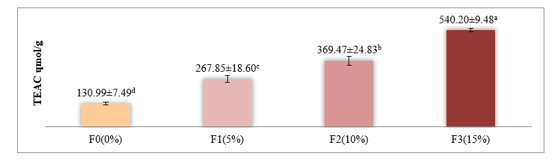 The results showed that The add ition of red fruit oil significantly increased the antioxidant activity of yogurt (p < 0.05). The highest value was observed in F3 (15%) at 540.20 ± 9.48 μmol TE/g extract (equivalent to 615.83 μmol TE/g sample), followed by F2 at 369.47 μmol TE/g, and F1 at 267.55 μmol TE/g. The control group, F0, had the lowest antioxidant activity at 130.99 ± 7.48 μmol TE/g. Post hoc Duncan’s Multiple Range Test (DMRT) showed no significant difference between F3 and F2, but both were significantly higher than F1 and F0. This trend indicates a positive correlation between red fruit oil concentration and antioxidant capacity up to a certain saturation point.