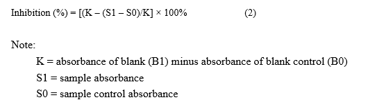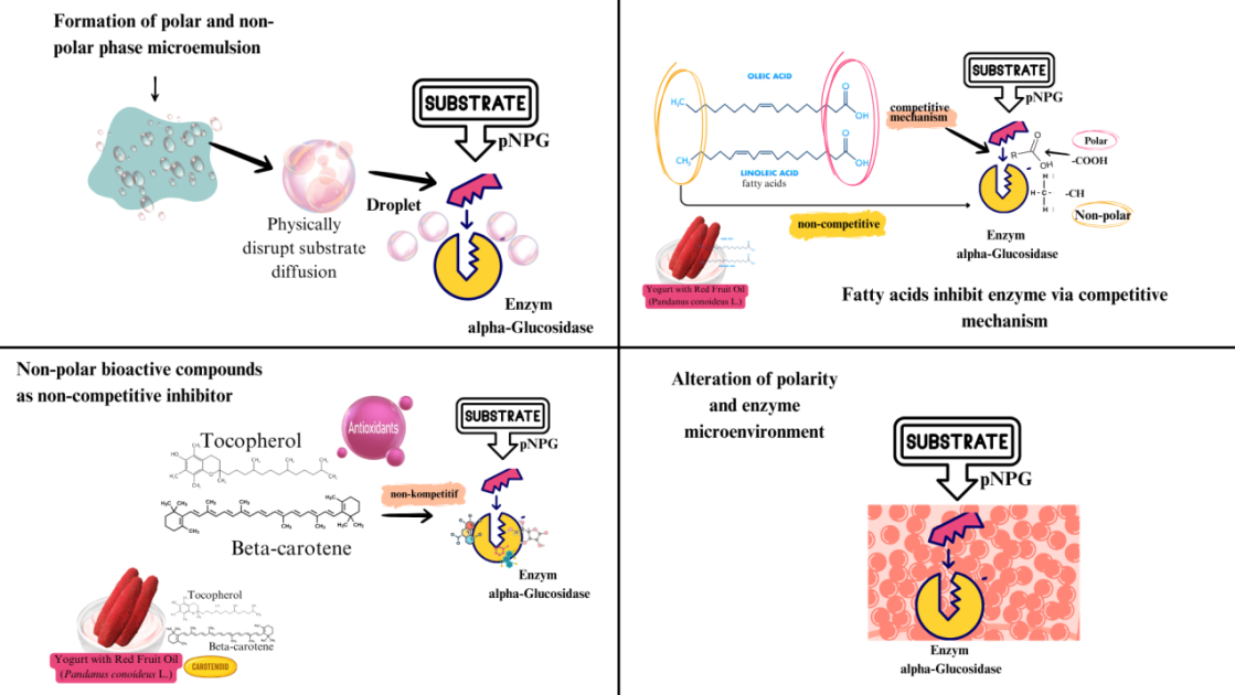 In vitro α-glucosidase inhibition was tested in yogurt samples enriched with red fruit oil and compared with that of acarbose, a positive control. The procedure followed the methods of Chaerunnisa et al. [17] and Agustin et al. [6], with modifications. The assay involved a sample solution (S1), control (S0), blank (B1), and blank control (B0). The substrate used was p-nitrophenyl α-D-glucopyranoside (pNPG) in 0.1 M phosphate buffer (pH 7.0). The enzyme was prepared by dissolving 1 mg of α-glucosidase in 100 mL of phosphate buffer to obtain 0.04 an activity. reaction mixture: 10 µL of sample, 50 µL of phosphate buffer, 25 µL of enzyme solution, and 25 µL of 10 mM pNPG and incubated at 37 °C for 30 min. The reaction was stopped with 100 µL of 0.2 M sodium carbonate, and the absorbance was measured at 410 nm using a microplate reader. All tests were performed in triplicate. The percentage of inhibition was calculated as follows: