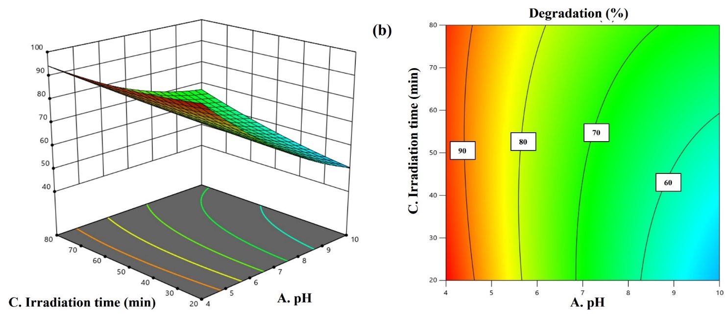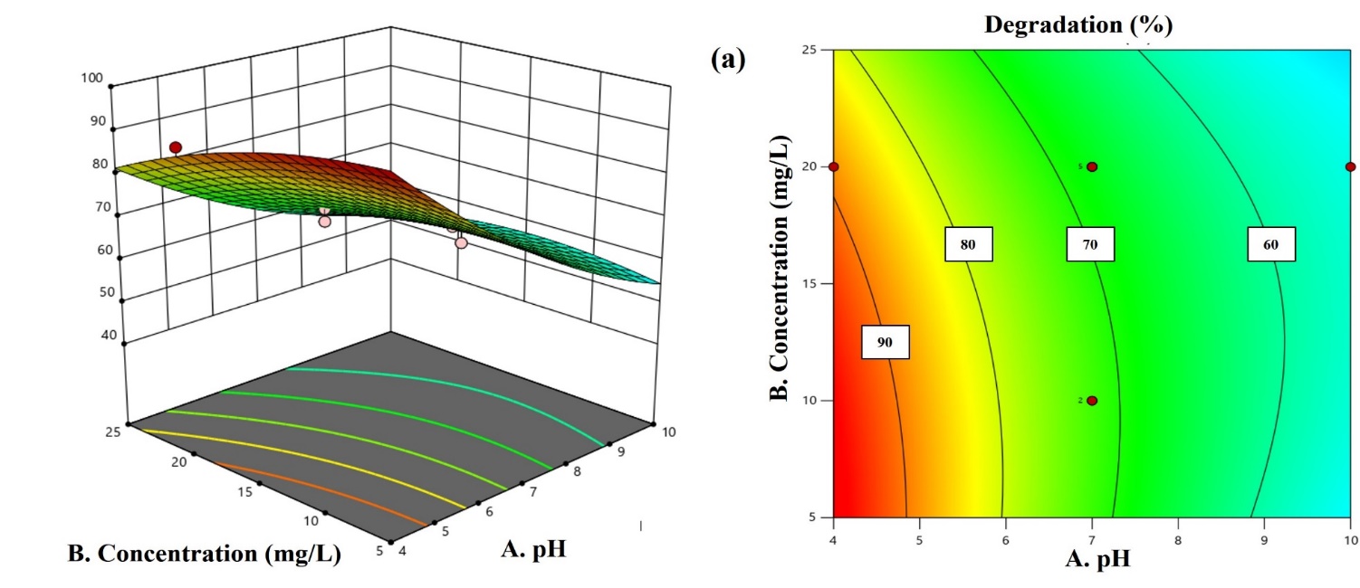 Figure 8 shows the contour plot and 3D surface response. This diagram illustrates the correlation between 3 independent factors and the response variable [39]. The 3D surface response demonstrates the variation of the response variable in relation to the interplay of 2 independent variables. The degradation efficiency is calculated by identifying the independent variable value that yields the optimal result. The degradation efficiency increases with decreasing pH and concentration, as evidenced by the red hue. The ZnFe₂O₄/SnO₂ composite possesses a pHpzc of 6.70, indicating that it is positively charged at solution pH values below this threshold. Electrostatic attractive interactions arise due to the anionic nature of Congo red dye, namely the ionization of the negatively charged sulfate group [22]. At elevated pH, the ZnFe₂O₄/SnO₂ composite combination exhibits a negative surface charge, which repels the negatively charged Congo red dye molecules. Additional research indicates that the degradation efficiency of Congo red is maximized at acidic pH levels [3,40].