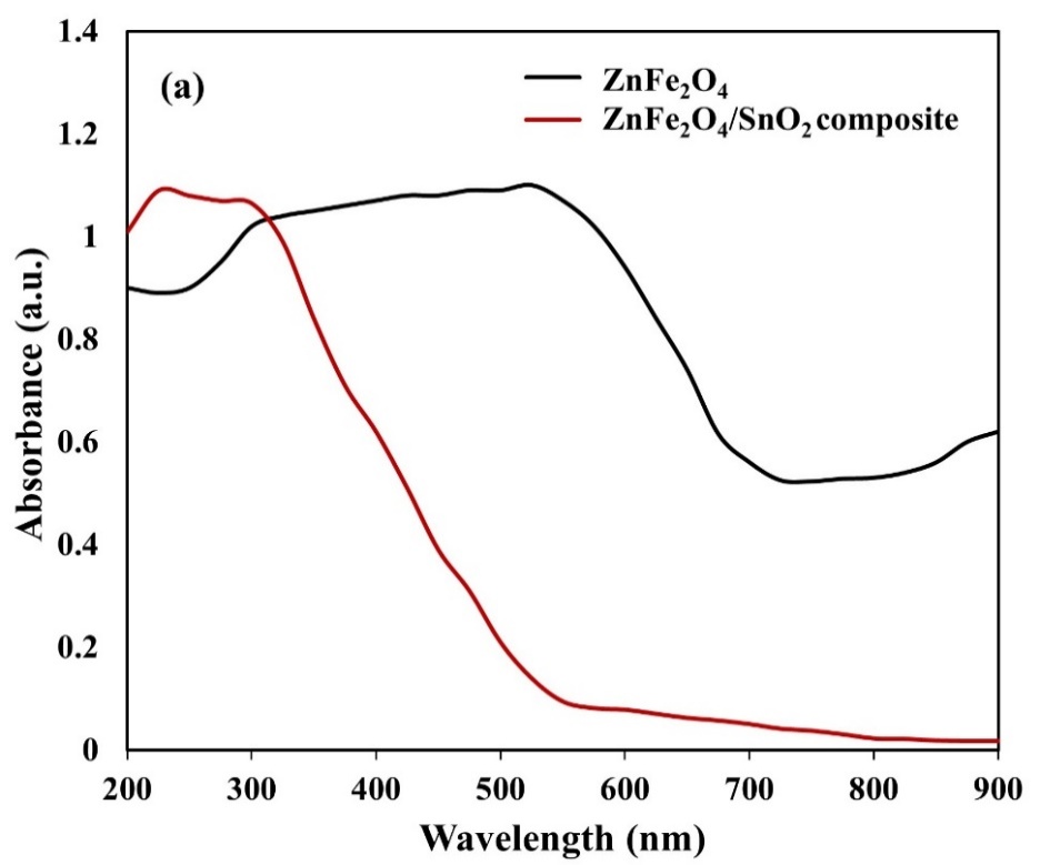 The SnO₂ peak in the UV-DRS spectra typically manifests in the ultraviolet range. The investigation conducted by Desouky et al. [23] determined the wavelength of SnO₂ to be 330 nm. The combination with NiFe₂O₄ induces a shift in the wavelength within the visible spectrum, approximately at 600 nm. This investigation suggests that the absorption peak of ZnFe₂O₄/SnO₂ occurs at 550 nm (Figure 2(a)). The band gap is an essential indicator that signifies the optical qualities and prospective applications of composites in photocatalysis. ZnFe₂O₄ is an n-type semiconductor with a low band gap (1.7 - 2.2 eV), whereas SnO₂ possesses a broad band gap (~3.6 eV) [25,32]. Charge transfer at the contact can diminish the energy necessary for electron excitation. The combined effect of ZnFe₂O₄ with SnO₂ can diminish the band gap of SnO₂. Figure 2(b) shows that the band gap of ZnFe₂O₄ is 1.98 eV, while that of the ZnFe₂O₄/SnO₂ combination is 2.46 eV. The findings align with other research, specifically indicating that the band gap value of ZnFe₂O₄ ranges from 1.89 to 1.92 eV when synthesized via the solution combustion method at temperatures between 400 and 1000 °C [27], whereas ZnFe₂O₄ synthesized through the laser ablation method exhibits a band gap between 2.17 and 2.27 eV [33].