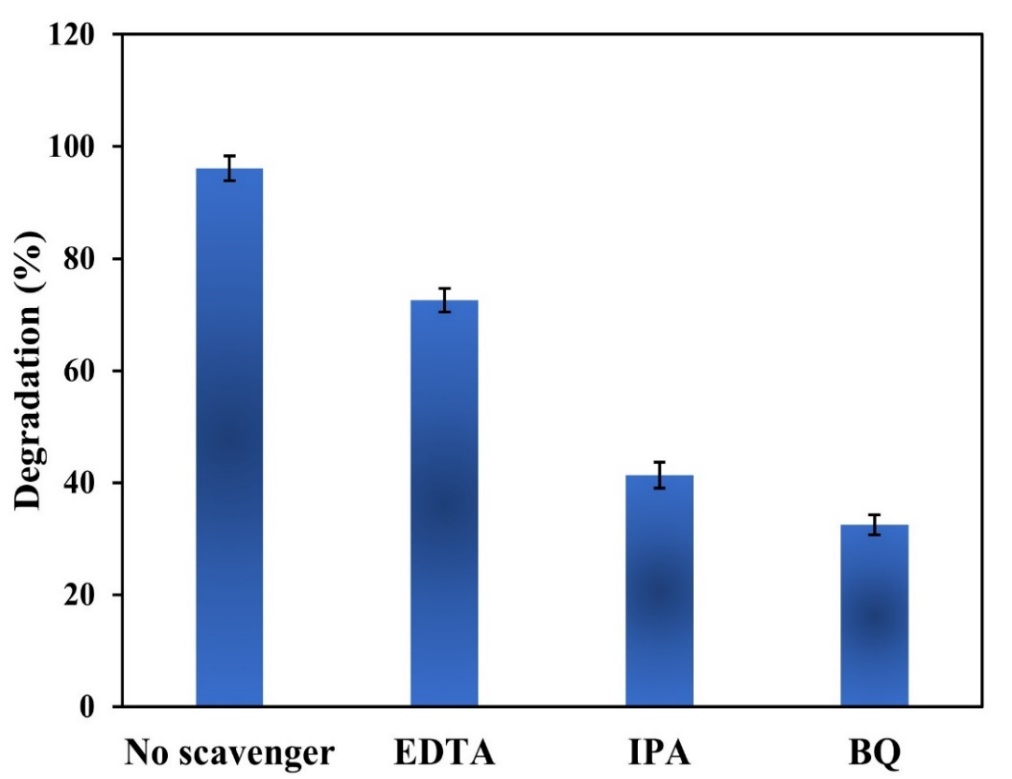 The scavenger study is employed to investigate the active species and the mechanism of electron transfer. The investigation utilized EDTA, BQ, and IPA. These 3 chemicals were added prior to the photocatalytic degradation of Congo red dye utilizing the ZnFe₂O₄/SnO₂ composite. The degradation mechanism was determined through the scavenger, which resulted in a substantial reduction in degradation efficiency. Figure 9 demonstrates that the ZnFe₂O₄/SnO₂ composite broke down 96.12 % of dye when no scavenger was used. However, when IPA, EDTA, and BQ were added, the breakdown degradation dropped to 72.56, 41.3, and 32.45 %, respectively. The results show that the main agents breaking down Congo red dye are BQ, especially superoxide radicals (•O₂⁻), followed by hydroxyl radicals (•OH⁻) and holes (ℎ⁺). Many studies show that superoxide radicals play an important role in breaking down substances, such as the Methylene blue dye when using Cu-doped α-MnO₂ [45] and the dye Congo red dye with Gd₂O₃ on g-C₃N₄ [46].