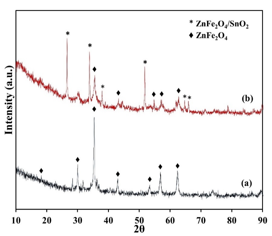 Figure 1 XRD pattern of (a) ZnFe2O4 and (b) ZnFe2O4/SnO2 composite.