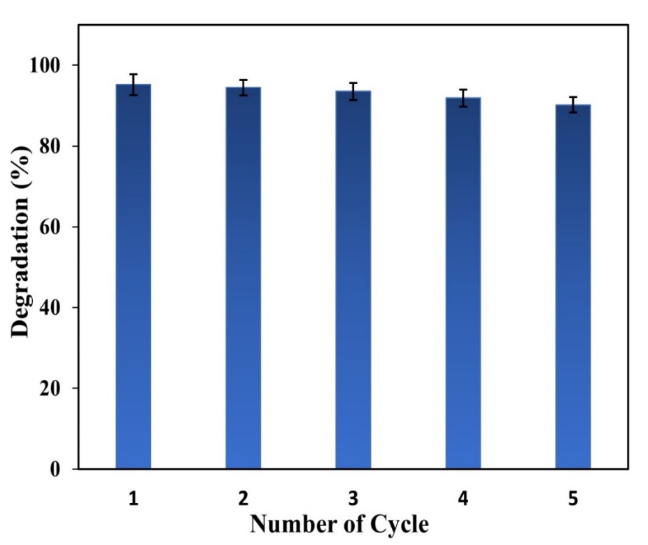 The reusability of ZnFe2O4/SnO2 composites is very important in cost-effectiveness, particularly when these composites are applied in industrial or environmental processes. To reuse ZnFe₂O₄/SnO₂, after the composite is used for photocatalytic degradation, it is separated from the solution using centrifugation. The composite is washed using distilled water and ethanol, followed by drying using an oven at a temperature of 80 °C for 2 h. The composite is reused for photocatalytic degradation of Congo red dye. The same work is carried out for 5 cycles. The degradation efficiency of 5 cycles is 95.23, 94.43, 93.51, 91.89, and 90.27 %. The decrease in degradation efficiency for each additional cycle shows that it is getting bigger, with an average decrease for each cycle of 1.2575 % (Figure 10). The loss of catalyst weight in subsequent cycles due to washing and drying may cause this phenomenon [47]. However, the ZnFe₂O₄/SnO₂ composite shows good performance because during 5 cycles, there is a decrease in degradation efficiency of only 4.96 %. This performance is better than the CoO-ZnO nanocomposite catalyst, which has a degradation efficiency reduction of 12.35 % in 5 cycles and 2.47 % in each cycle for the photocatalytic degradation of Methyl red dye [37]. The ability of composites to be reused effectively is an advantage because it minimizes costs in waste processing.