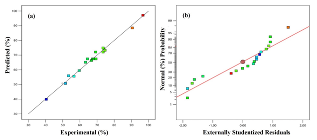 The model’s validity can be assessed by the normal distribution of the residuals and the graphs comparing predicted and experimental values. If the points on the graph align along a straight line (approaching the diagonal), the residuals are deemed to be normally distributed. Substantial divergences from this line suggest that the model fails to forecast accurately for certain data. Figure 7 illustrates a random distribution of data around the diagonal line, suggesting that the employed model predicts the response with considerable accuracy.