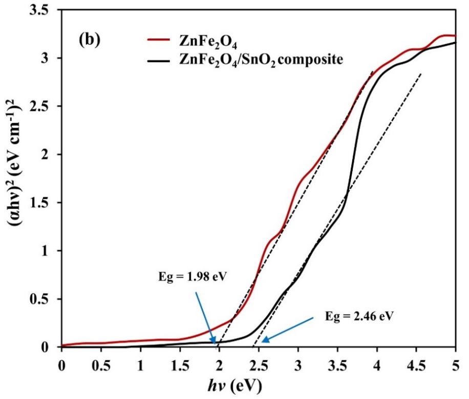 Figure 2 (a) UV DRS absorption spectra and (b) Plot of (αhυ)2 against hυ of ZnFe2O4 and ZnFe2O4/SnO2 composite.