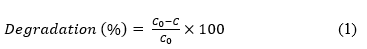 Degradation (%) = (171.19532 – 18.0455A – 0.442865B - 0.492599C + 0.127759AB + 0.052407AC +